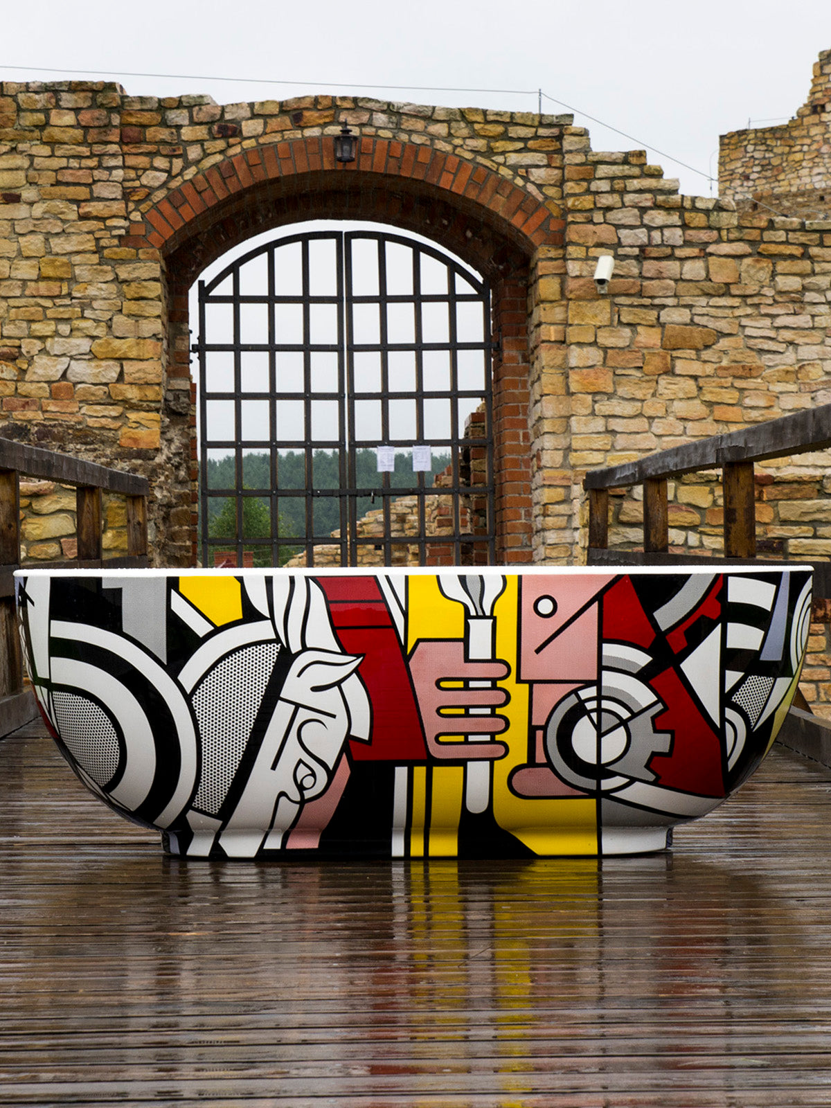 Na załączonym zdjęciu widzimy wannę Modern Roy, której wzornictwo nawiązuje do stylu Roya Lichtensteina, pełne żywych kolorów i dynamicznych linii. Taka wanna może stać się wyjątkowym elementem dekoracyjnym, doskonale współgrającym z nowoczesnymi tapetami lub neutralnymi ścianami, tworząc spójną i stylową przestrzeń. Wzorzysta wanna dodaje wnętrzu wyrazistości i nowoczesnego charakteru, stając się główną ozdobą łazienki.