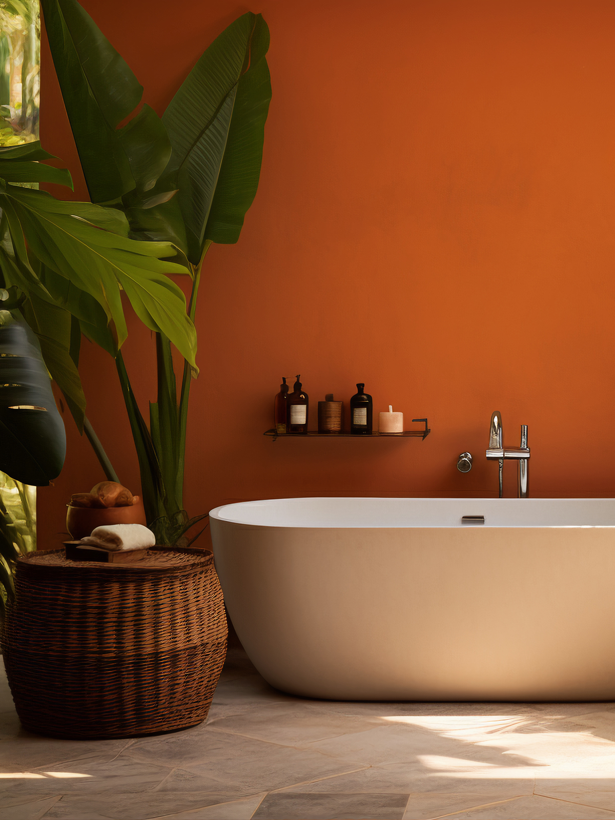 W 2024 roku dominować będą ciepłe, stonowane kolory ziemi, takie jak brązy, beże i zielenie. Te kolory tworzą przytulną atmosferę i są łatwe do połączenia z naturalnymi materiałami. Na załączonym zdjęciu widzimy łazienkę, gdzie pomarańczowe ściany w połączeniu z zielenią roślin i naturalnymi elementami, takimi jak drewniany stolik i wiklinowy kosz, tworzą ciepłą i zachęcającą przestrzeń. Taka aranżacja idealnie wpisuje się w najnowsze trendy, wprowadzając do wnętrza więcej życia i energii. Wanna Space doskonale pasowałaby do takiej aranżacji, łącząc funkcjonalność z nowoczesnym designem i podkreślając elegancję wnętrza.
