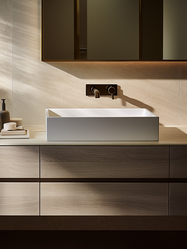 Minimalistyczne łazienki z czystymi liniami i funkcjonalnymi rozwiązaniami pozostają w modzie. Kluczowe elementy to proste kolory, zredukowana ilość dekoracji i wbudowane opcje przechowywania, które utrzymują przestrzeń wolną od bałaganu. Na załączonym zdjęciu widzimy łazienkę, która doskonale ilustruje te zasady. Jasne, neutralne kolory oraz proste, eleganckie linie tworzą harmonijną i uporządkowaną przestrzeń. Umywalka nablatowa Gladio z oferty Ravon idealnie wpisuje się w taki minimalistyczny design, oferując elegancki i nowoczesny wygląd. Dzięki swojej prostocie i funkcjonalności, umywalka ta stanowi doskonały wybór do nowoczesnych, minimalistycznych łazienek, podkreślając ich estetykę i praktyczność.