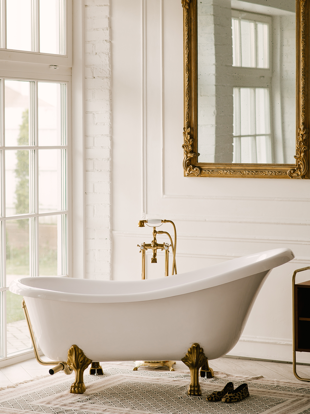 Na załączonym zdjęciu widzimy łazienkę urządzoną w stylu vintage, gdzie centralnym punktem jest wolnostojąca wanna na ozdobnych nogach. Jej klasyczne linie i elegancki design doskonale wpisują się w estetykę minionych epok. Obok wanny znajduje się bogato zdobione lustro w złotej ramie, które podkreśla luksusowy charakter wnętrza. Złote elementy armatury, takie jak kran i nogi wanny, harmonizują z resztą dekoracji, dodając całości elegancji i klasy.