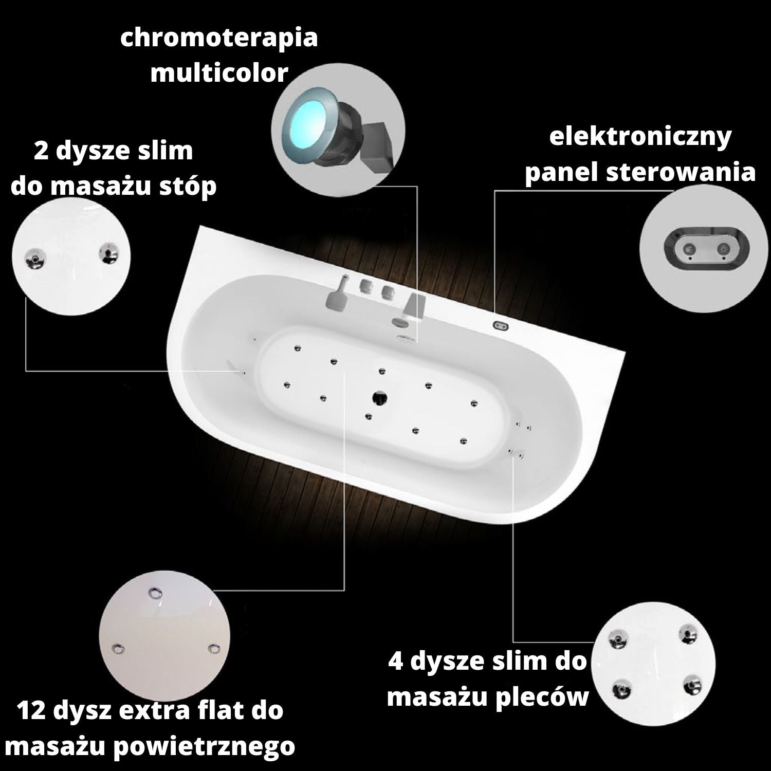 The water massage itself relaxes tense muscles, improves circulation, relaxes and has a warming effect. Hydromassage is a blessing for rheumatological problems, spine disorders, increased tension, etc. It does not leave any part of the body without help. It affects joints and muscles. Hydromassage relies on appropriately set pressure of water flowing from the nozzles. Movable or stationary water jets are located on all side (including front and rear) walls of the bathtub. The hydromassage is controlled by a panel placed on the edge of the bathtub or a remote control. You decide how the water will massage you.