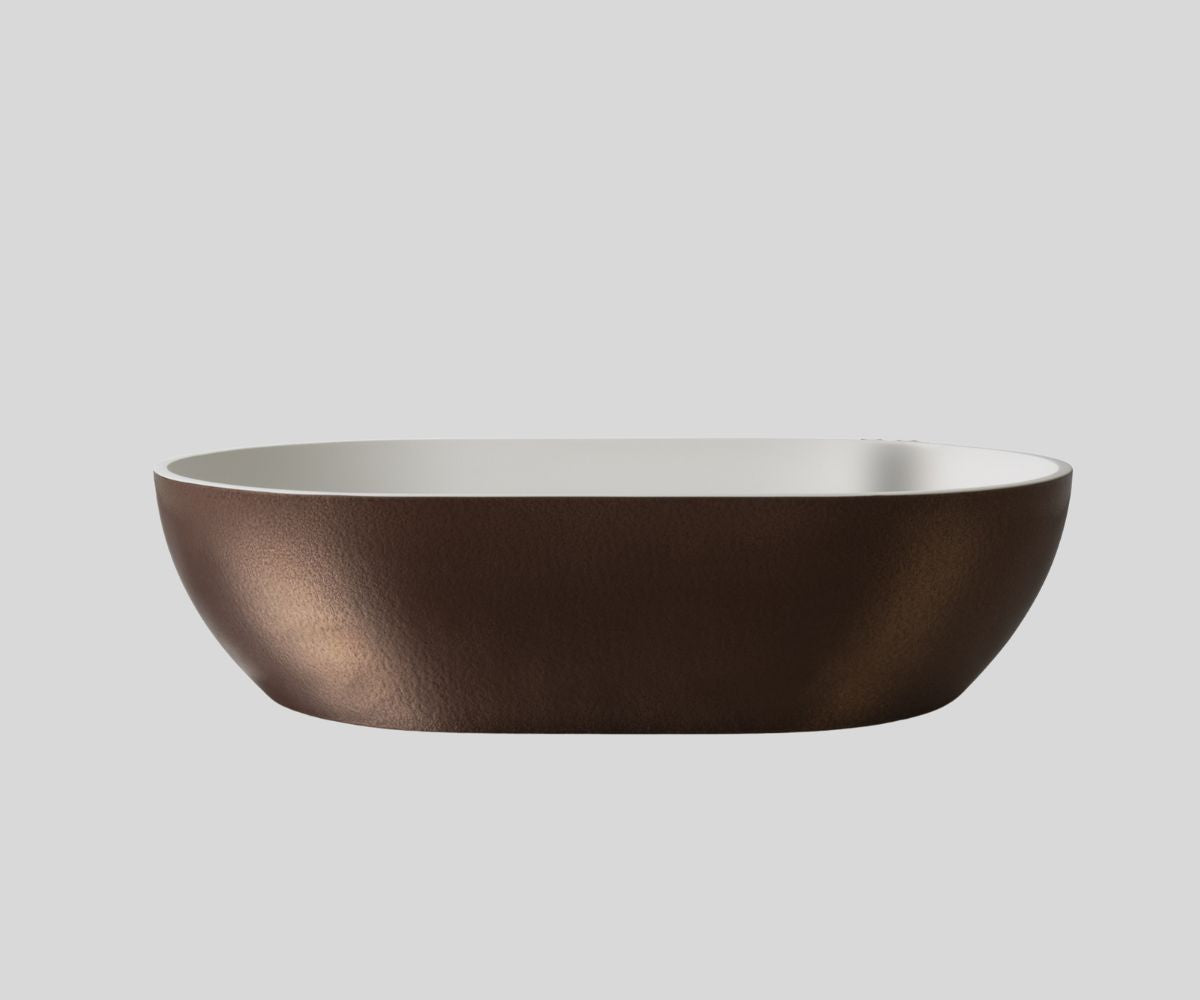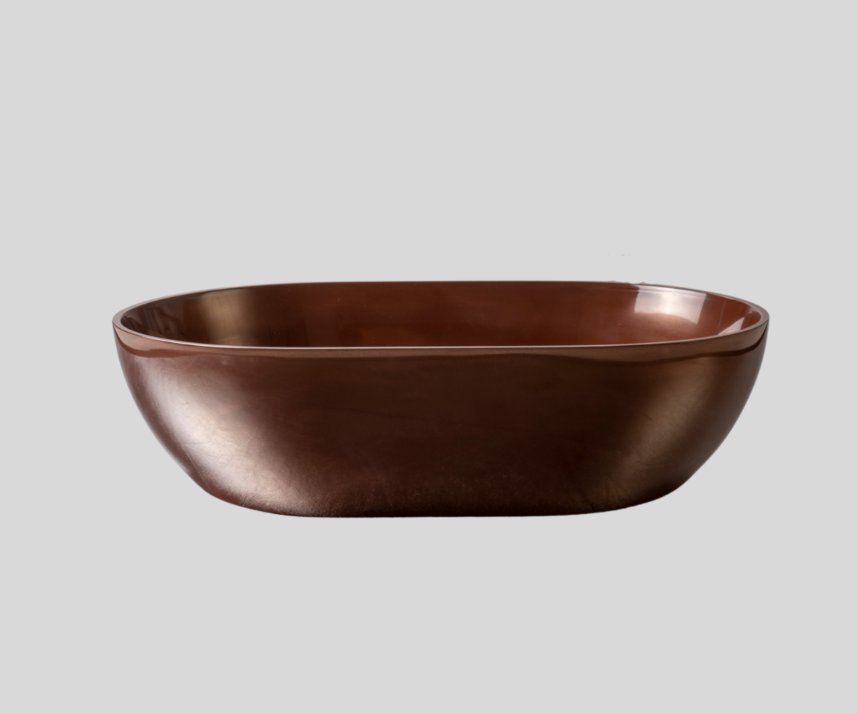 The washbasin is made in two colors with a metal coating. Inside the washbasin, classic white gloss (Marmonite) or matt (PureStone). On the outside of the washbasin, any PuroMetal coating color, Antic or Gloss structure selected from the Ravon Metal palette, page 31. Waiting time depending on the number of orders: 3 to 4 weeks.