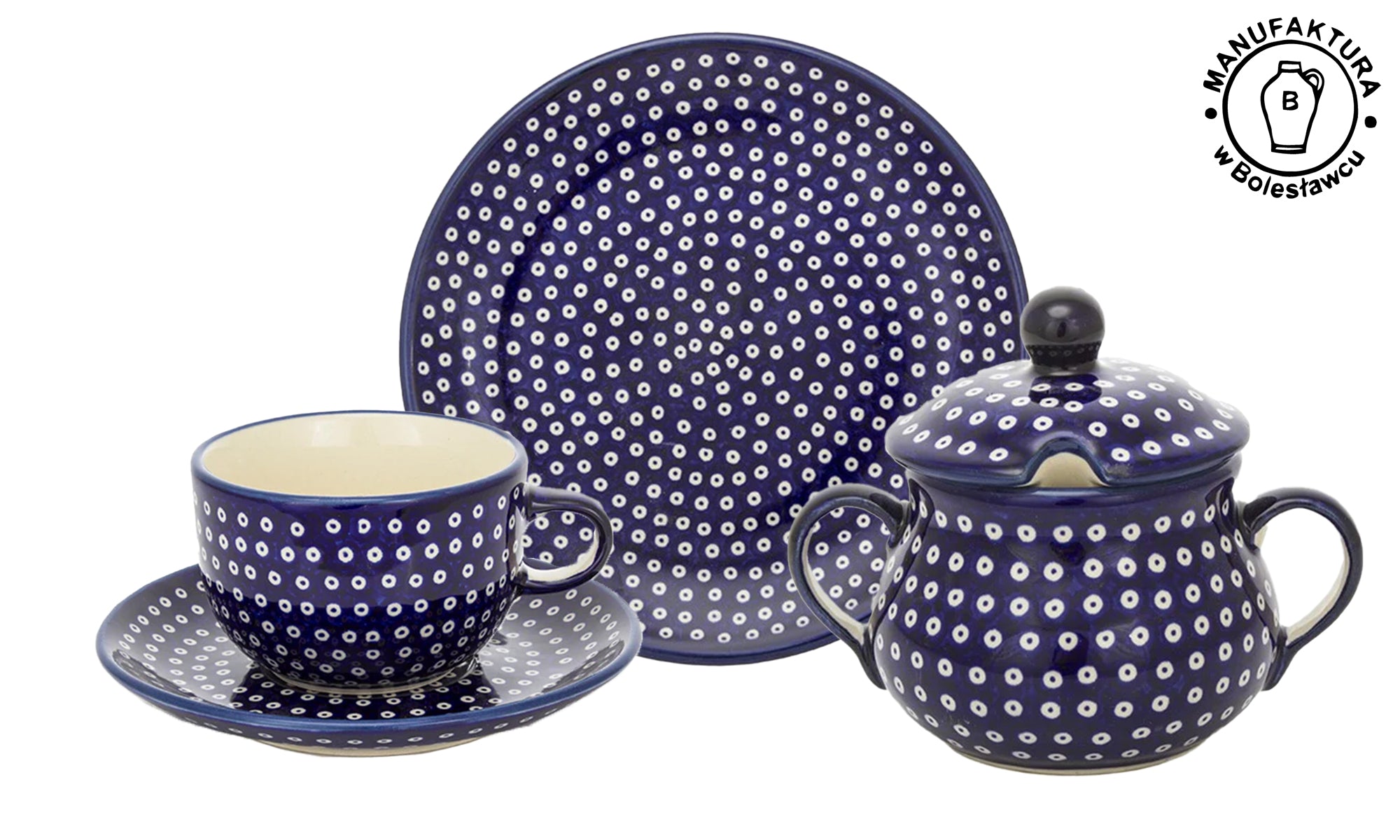 Wzór kropki ecru z kobaltowym punktem często pojawia się na ceramice z Bolesławca zachwycając nieprzemijającym designem.