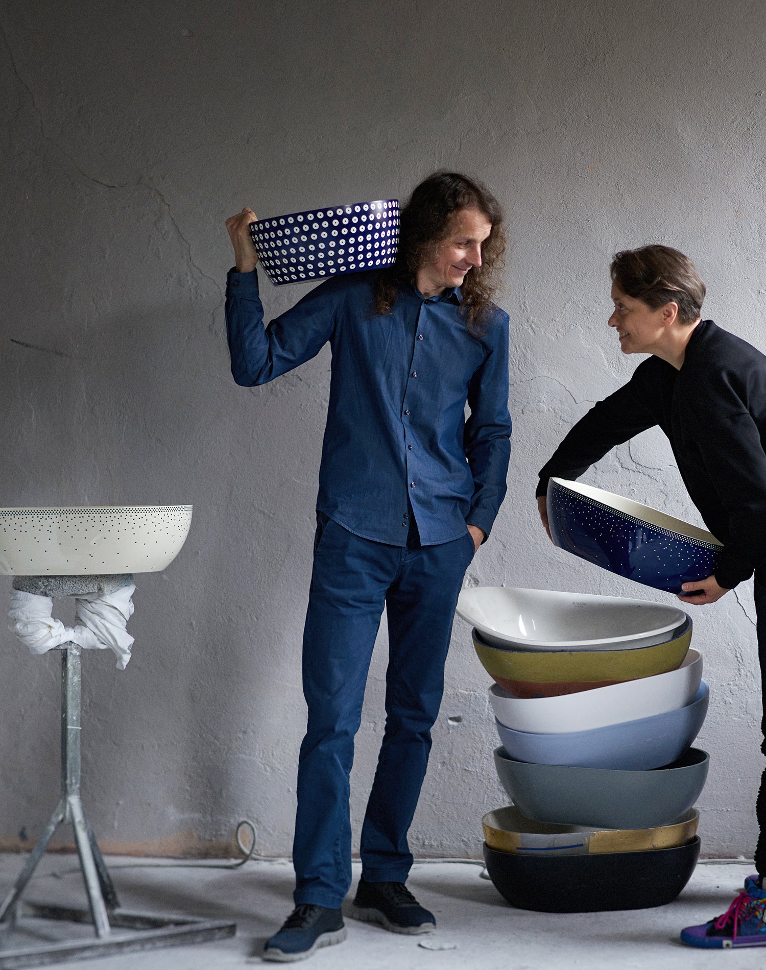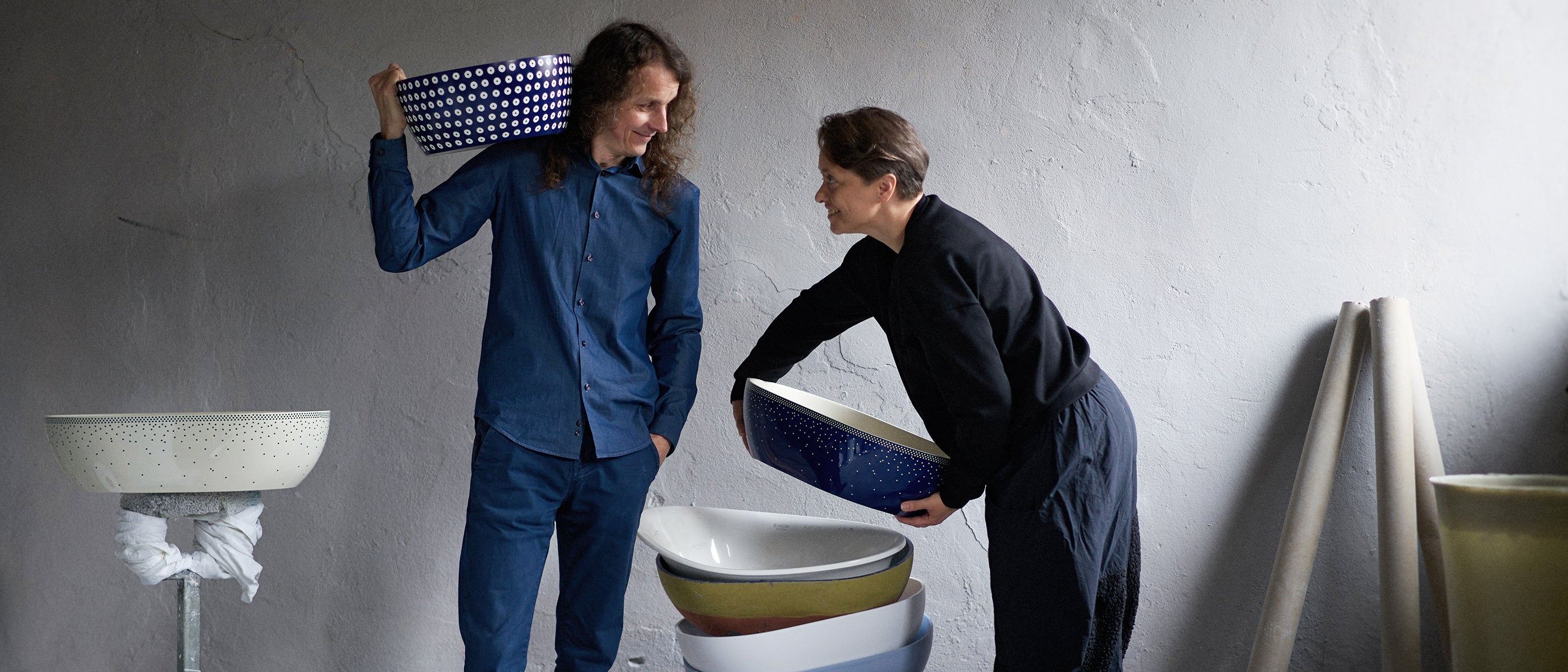 Połączenie minimalistycznej bryły z wyrazistym, inspirowanym ceramiką ludową wzorem w stylu polka dot. Najbardziej charakterystyczna wersja kolorystyczna – kobaltowe wykończenie zewnętrzne z kontrastującym wnętrzem w kolorze ecru – podkreśla ręczne wykończenie i unikalny charakter produktu.