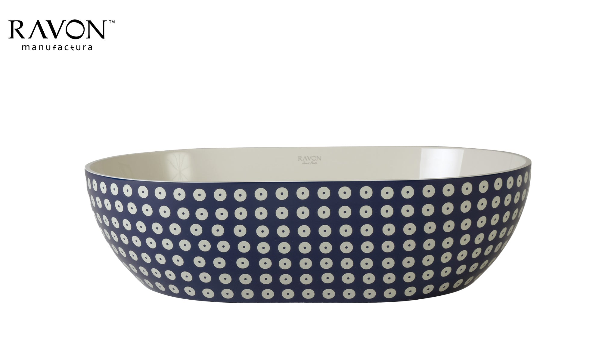 Wzór PolkaDot został przeniesiony na formę umywalki nablatowej Space i występuję w najbardziej charakterystycznej wersji kolorystycznej: kobalt na zewnątrz – ecru wewnątrz. Kolorystyka nawiązuje do tradycyjnych dla Manufaktury w Bolesławcu kubków i filiżanek.