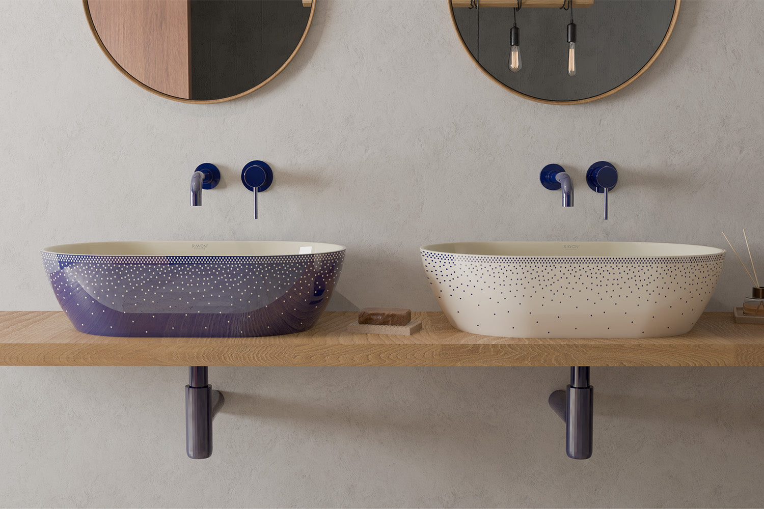 Delikatny, rozproszony na powierzchni wzór Serenity zdobi wannę wolnostojącą Space, przenosząc nowoczesną dekorację bolesławieckiej ceramiki do łazienkowego wnętrza. Minimalistyczny motyw, stworzony za pomocą prostego stempla, przywołuje na myśl gwiezdne konstelacje i deszcz Perseidów. To subtelne, rękodzielnicze zdobienie harmonijnie łączy się z formą wanny, tworząc projekt pełen spokoju i lekkości idealny zarówno do przestrzeni nowoczesnych, jak i klasycznych.