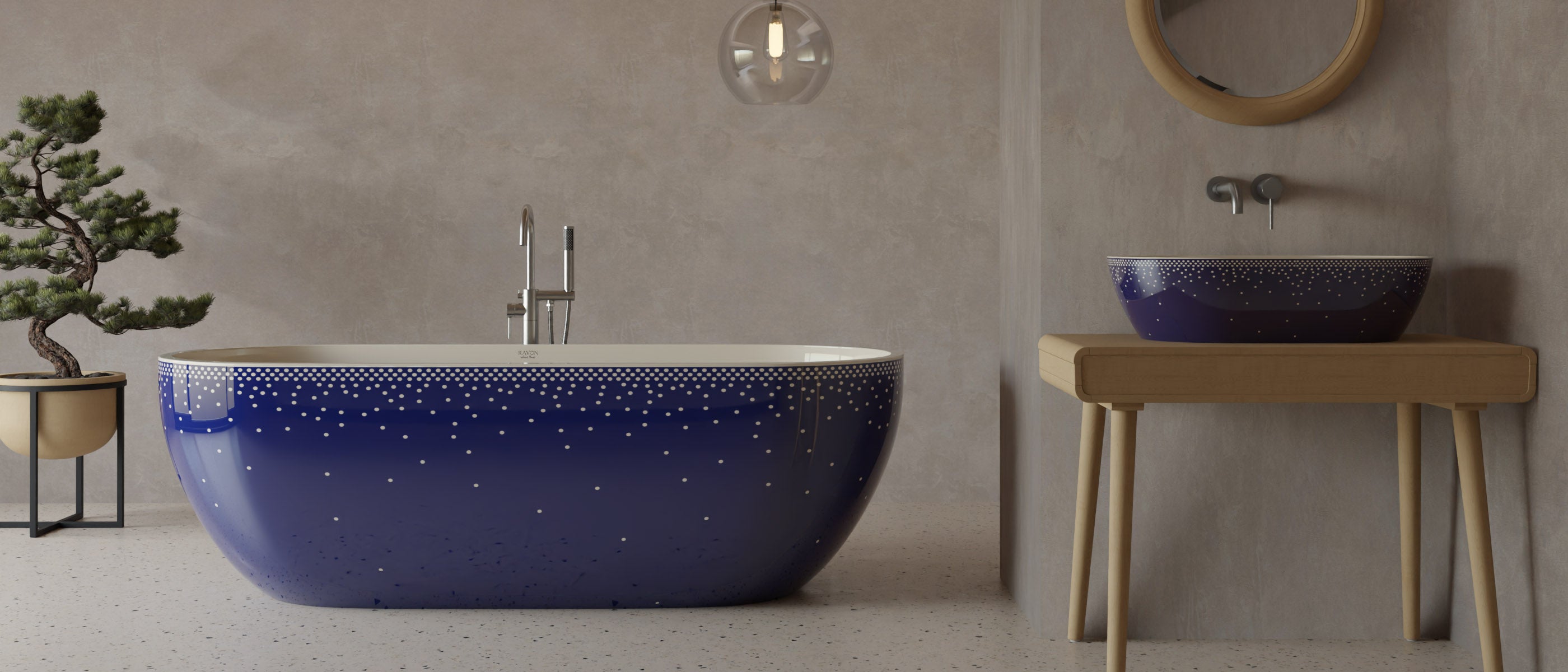 Wanna Space z kolekcji Serenity wykończona została klasycznym kobaltem z ręcznie nanoszonymi stemplami w kolorze ecru. Wnętrze wanny utrzymane jest w jednolitym odcieniu ecru, co tworzy elegancki, kontrastowy efekt. Starannie rozmieszczone stemple na zewnętrznej powierzchni nadają bryle rytm i głębię, a jednocześnie podkreślają rzemieślniczy charakter całej kolekcji.
