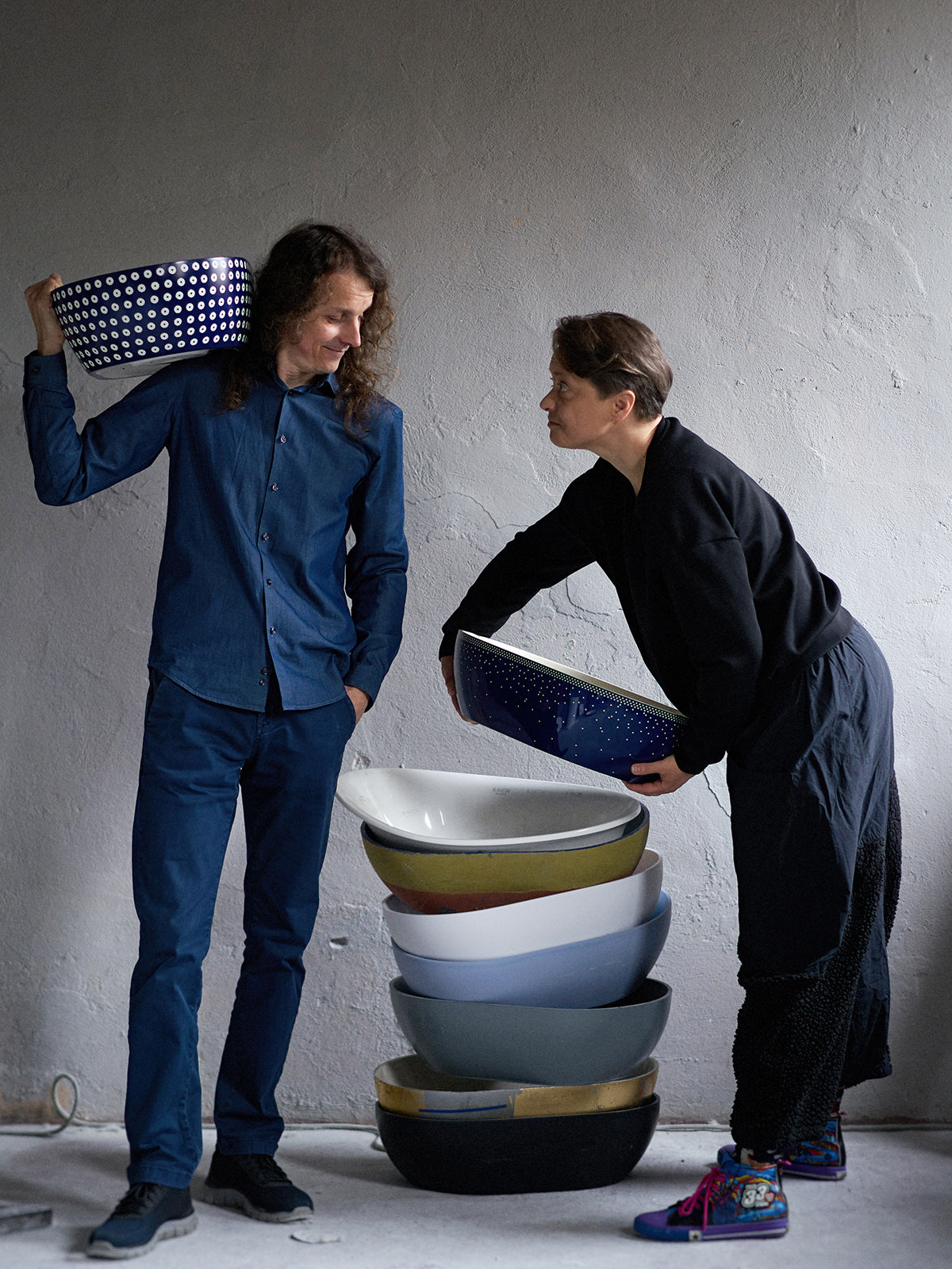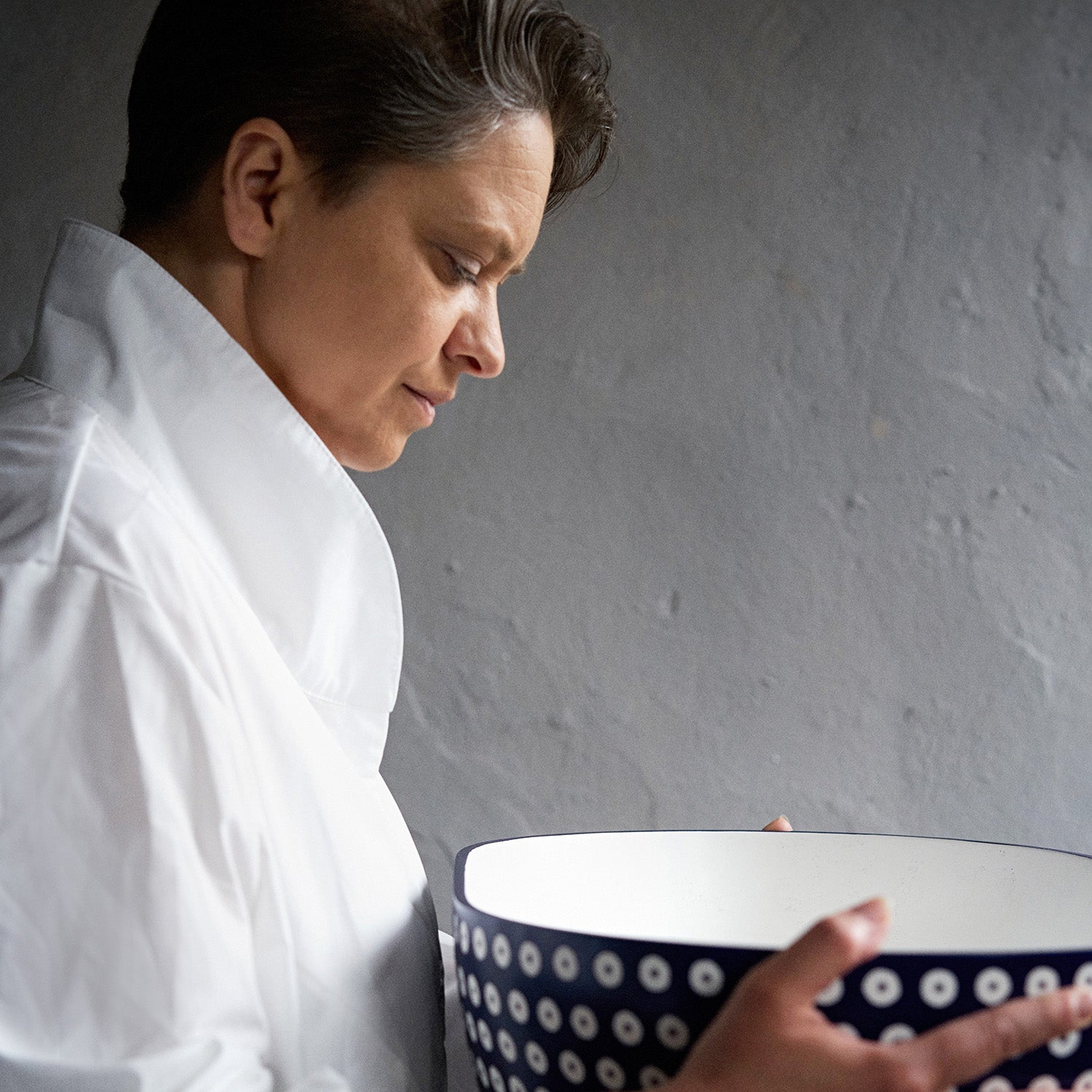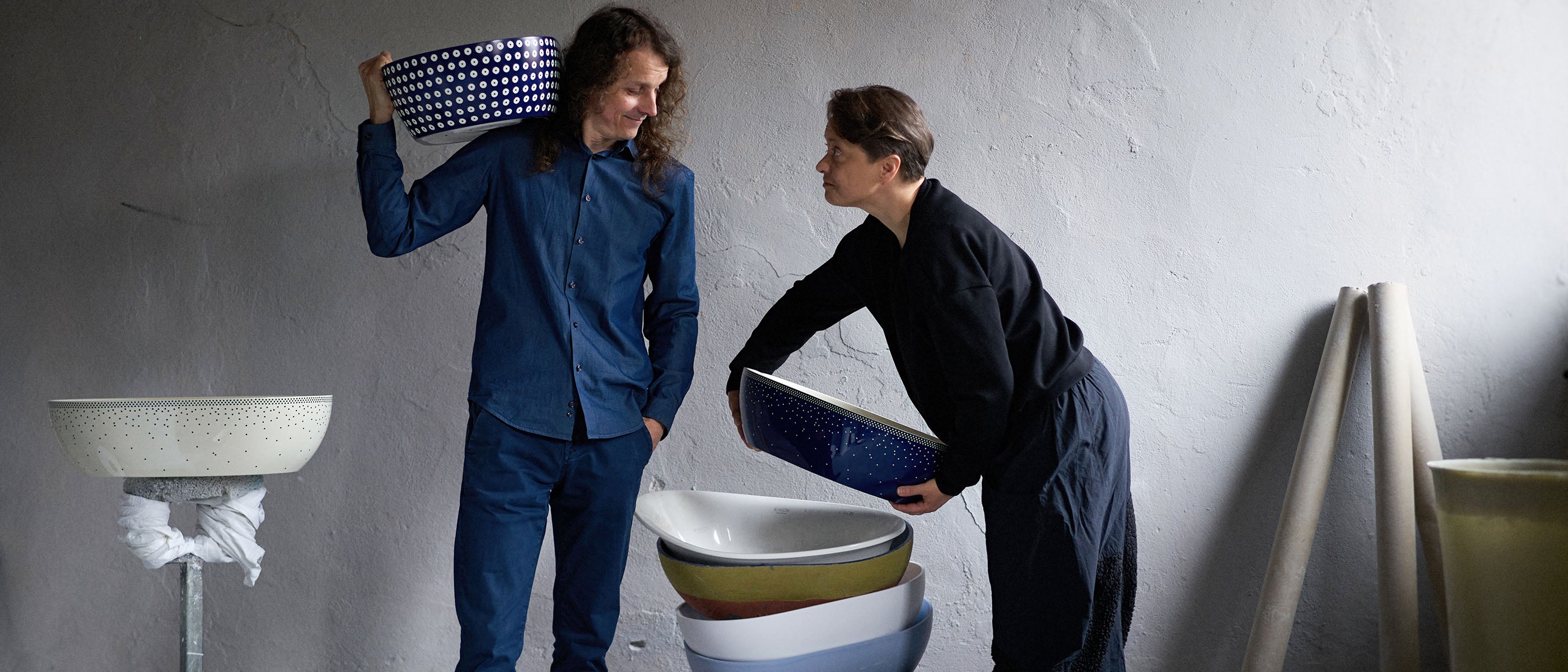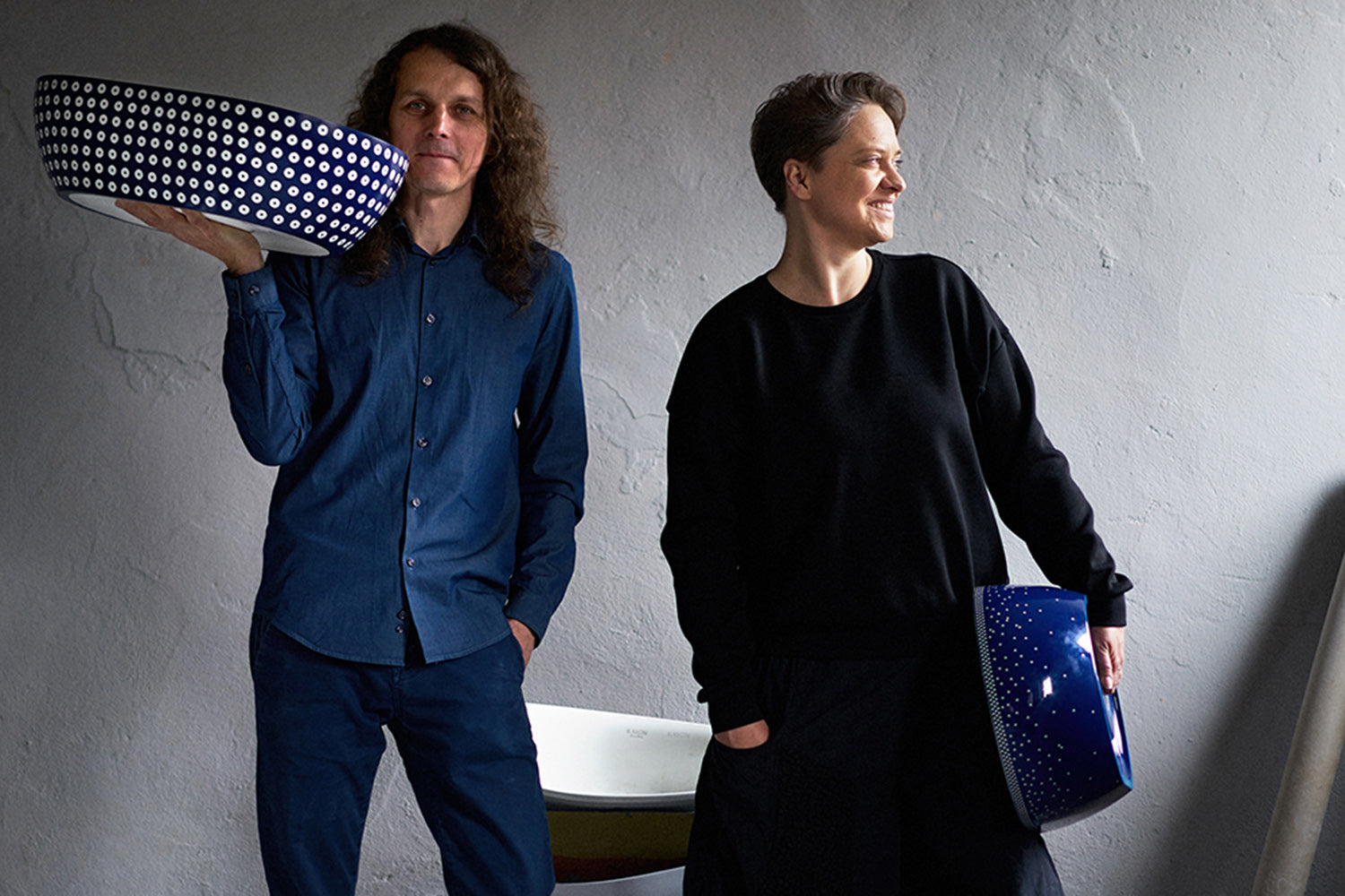 Połączenie minimalistycznej bryły z wyrazistym, inspirowanym ceramiką ludową wzorem w stylu polka dot. Najbardziej charakterystyczna wersja kolorystyczna – kobaltowe wykończenie zewnętrzne z kontrastującym wnętrzem w kolorze ecru – podkreśla ręczne wykończenie i unikalny charakter produktu.