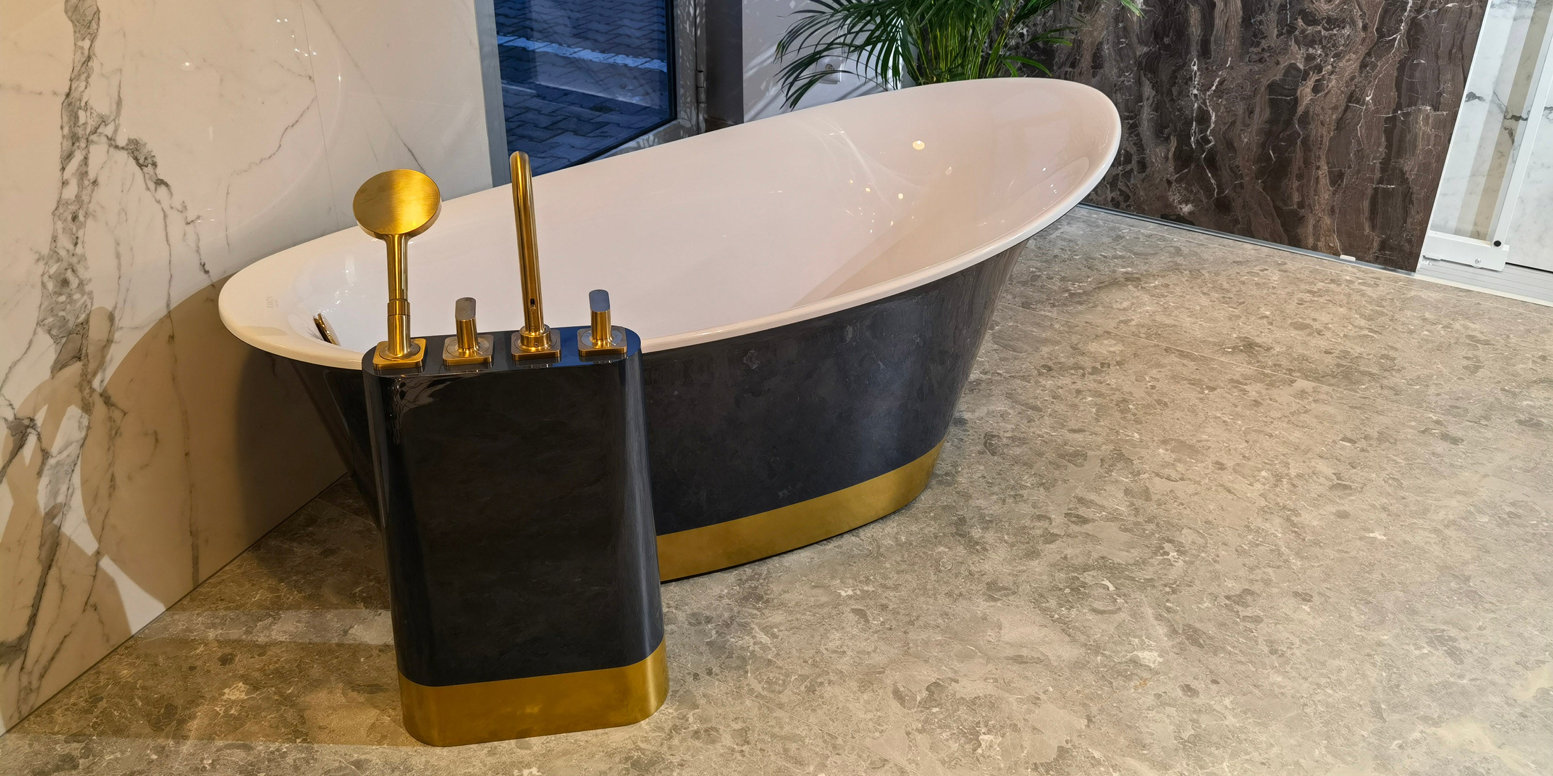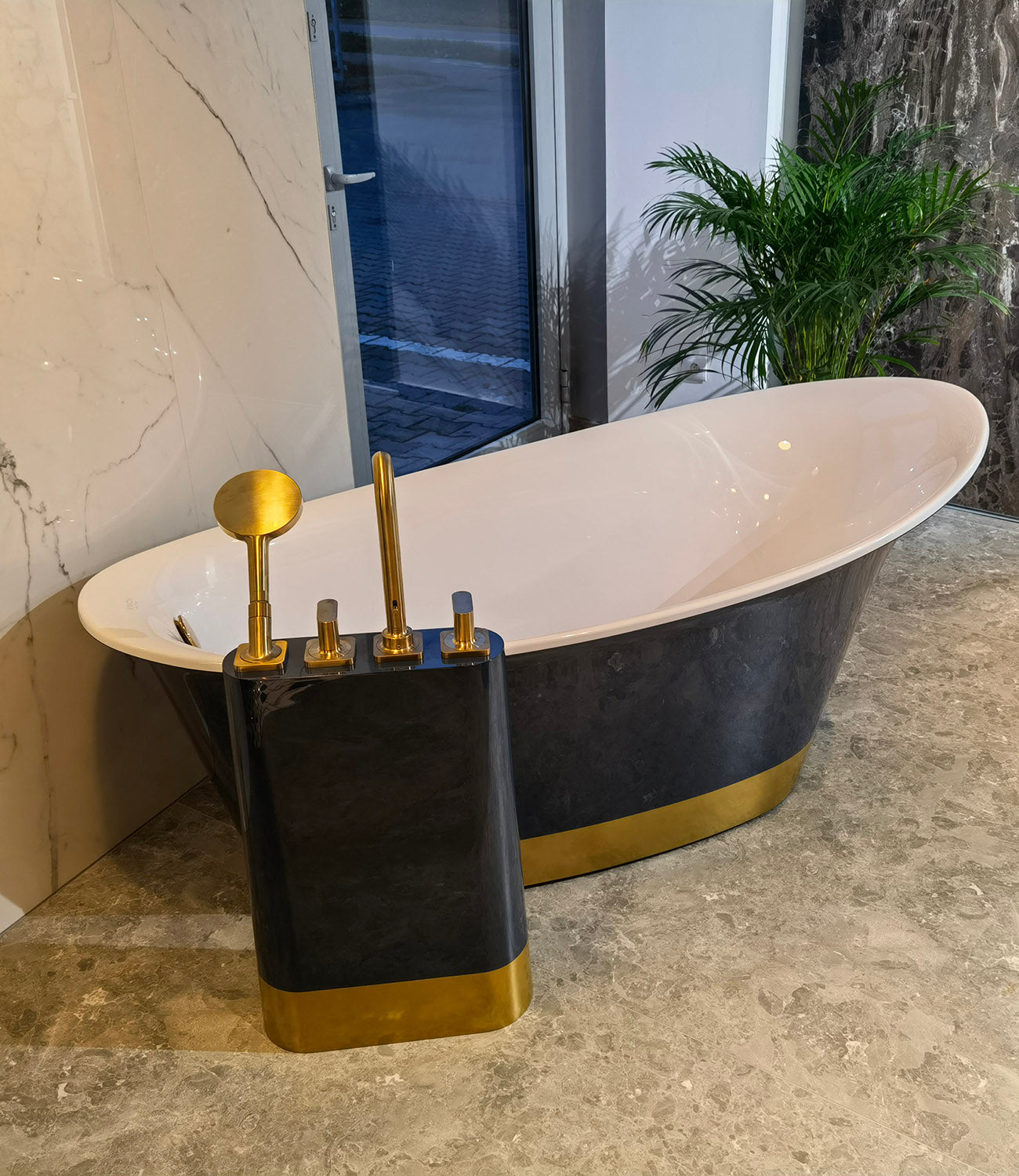 Postument Ravon zastępuje tradycyjną baterię wolnostojącą podłogową, eliminując konieczność kucia posadzki. Jego elegancka i nowoczesna forma przyciąga wzrok, a jednocześnie jest niezwykle praktyczna. Możesz na nim umieścić lampkę wina, kosmetyki czy inne niezbędne akcesoria, co czyni go nie tylko funkcjonalnym, ale także stylowym dodatkiem do Twojej łazienki.
