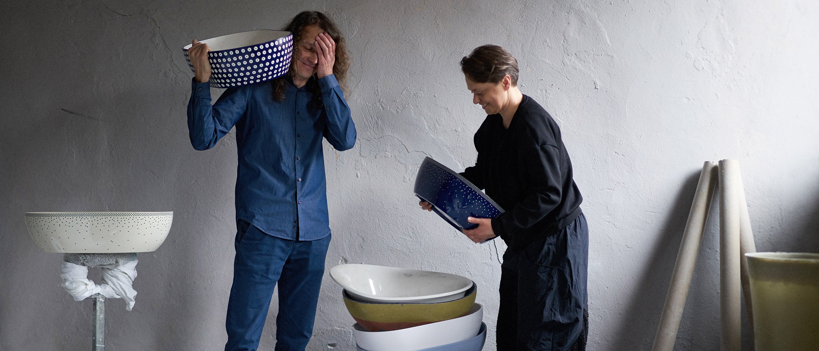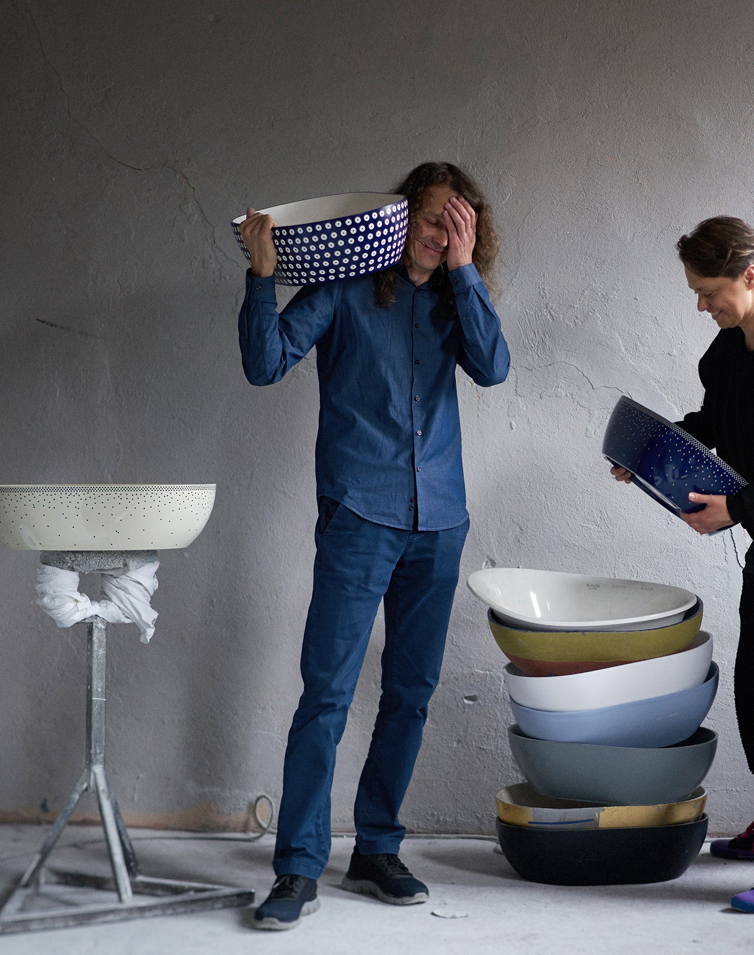 Połączenie minimalistycznej bryły z wyrazistym, inspirowanym ceramiką ludową wzorem w stylu polka dot. Najbardziej charakterystyczna wersja kolorystyczna – kobaltowe wykończenie zewnętrzne z kontrastującym wnętrzem w kolorze ecru – podkreśla ręczne wykończenie i unikalny charakter produktu.